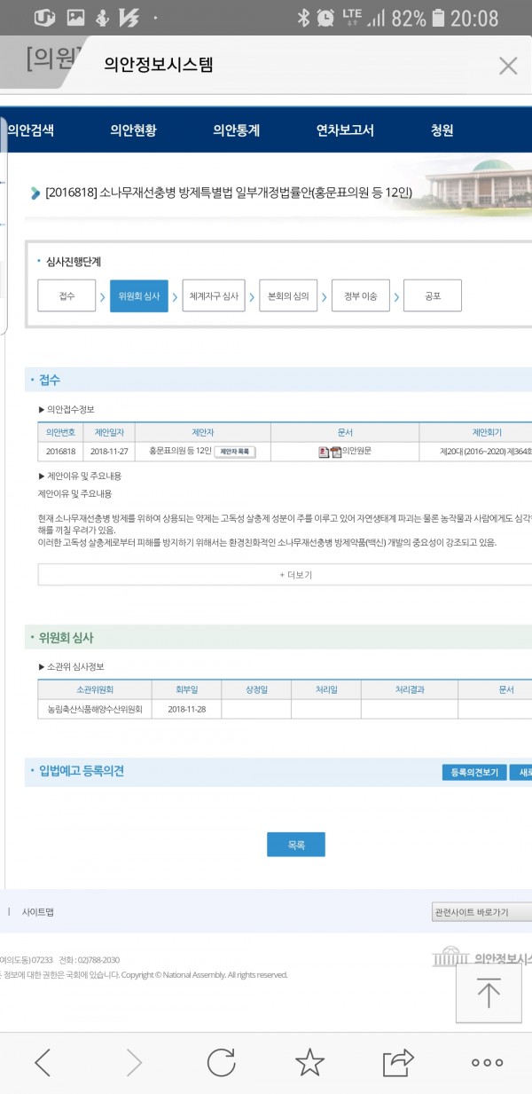 홍문표의원의 '소나무재선충병 방제 특별법 일부 개정'의 건이 소관위원회인 농림축산식품해양수산위원회에 공식의안으로 2018년11월 27로 접수되어 다음날 해당위원회 회부되었다.